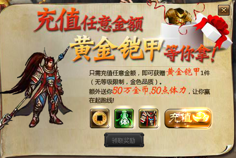 黄金铠甲x1(无等级限制,穿戴后立即变换高端造型)、50W金币、50点体力