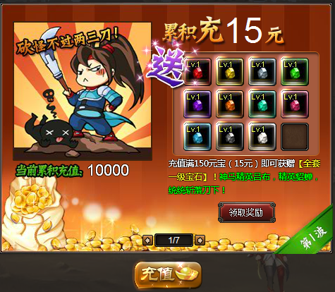 1、新服累计充值达15元,即可额外获得1级宝石礼包: