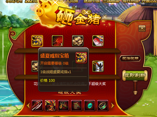 金猪储蓄罐里面包含大量金币、各种幻甲套装、坐骑兽魂、神兵部件、高等战甲、A级圣物等等超值道具,只要20元宝就有机会获得哦~绝对划算!