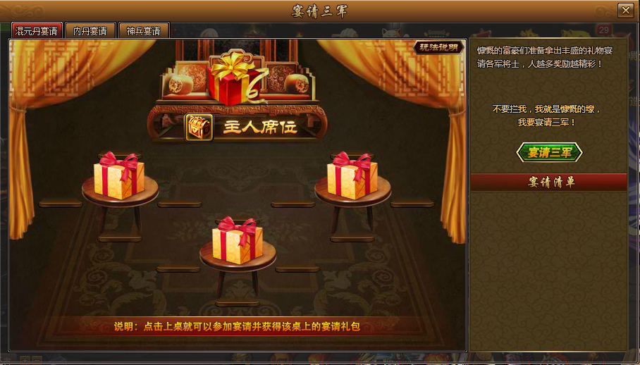 玩家可点击宴请三军,宴请后其他玩家可点击我要参加进入宴请三军进行上桌,每次宴请有三桌不同礼包,每桌可上桌4位玩家 宴会结束时上桌玩家可获得赠送的相应礼包。