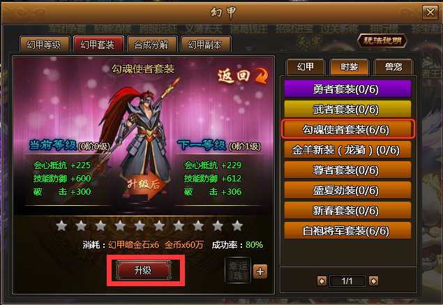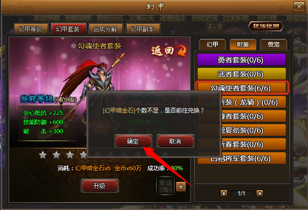 玩家可通过点击幻甲套装中升级进入兑换页面