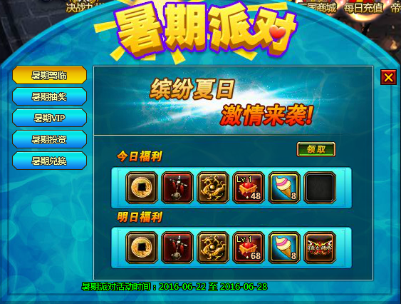 6月23日0点-6月29日23点59分,玩家可以在每日俸禄中免费领取“夏日派对礼包”。