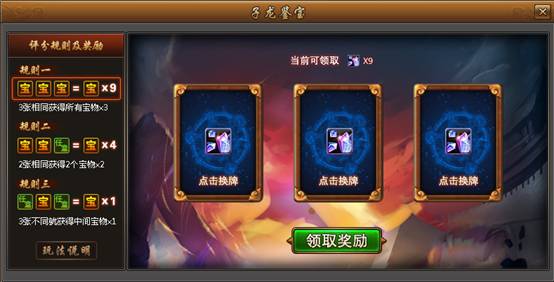 玩家领取每日活跃宝箱即可获得道具【鉴宝符】,使用【鉴宝符】参与子龙鉴 宝活动。