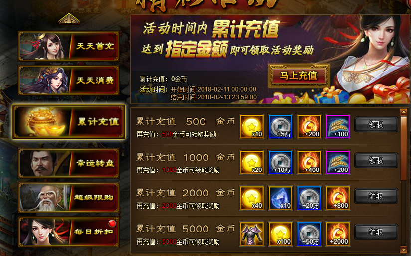 活动内容:活动期间累计充值达到指定金额即可领取丰厚奖励。