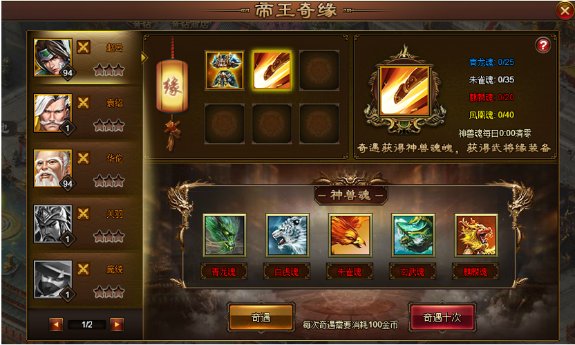 活动内容:活动期间可通过奇遇一次或奇遇十次神兽魂魄,收集神兽魂魄达到要求可获得金色装备。