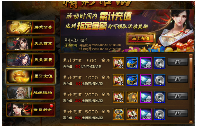 活动内容:活动期间累计充值达到指定金额即可领取丰厚奖励。