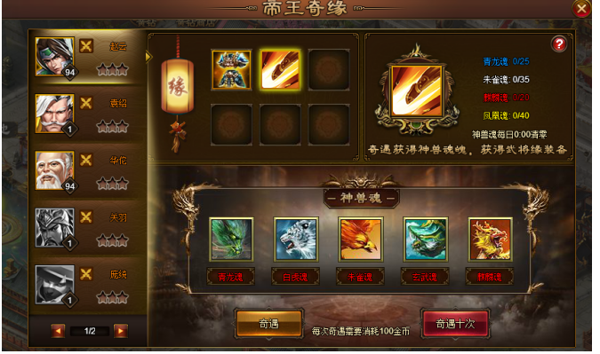 活动内容:活动期间可通过奇遇一次或奇遇十次神兽魂魄,收集神兽魂魄达到要求可获得金色装备。