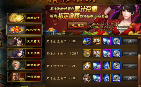 活动内容:活动期间单日累计充值达到指定金额即可领取丰厚奖励,奖励每日重置。