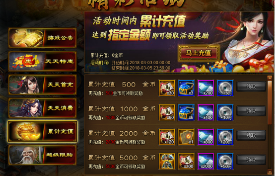 活动内容:活动期间累计充值达到指定金额即可领取丰厚奖励。
