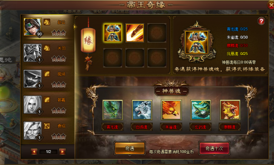 活动内容:活动期间可通过奇遇一次或奇遇十次神兽魂魄,收集神兽魂魄达到要求可获得金色装备。