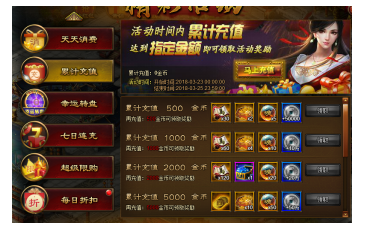 活动内容:活动期间累计充值达到指定金额即可领取丰厚奖励。