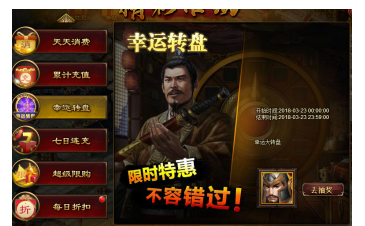 活动内容:活动期间转盘限时驻留金色武将张辽。