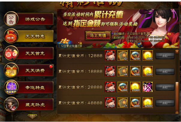活动内容:活动期间单日累计充值达到指定金额即可领取丰厚奖励,奖励每日重置。