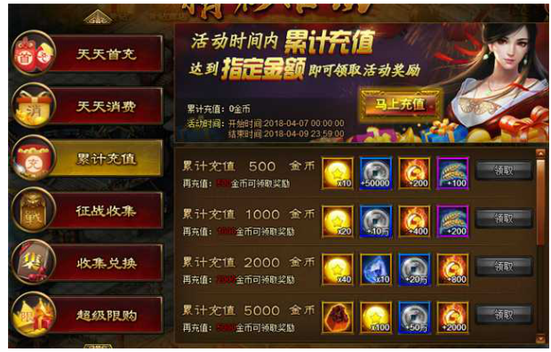 活动内容:活动期间累计充值达到指定金额即可领取丰厚奖励。