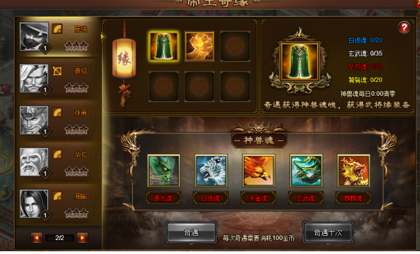 活动内容:活动期间可通过奇遇一次或奇遇十次神兽魂魄,收集神兽魂魄达到要求可获得金色装备或金色技能。