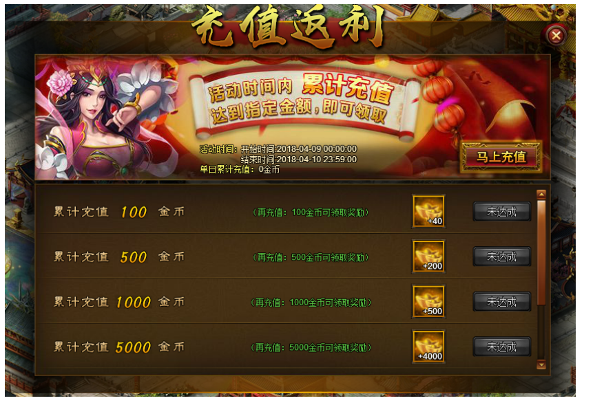 活动内容:活动期间单天充值达到指定金额即可领取丰厚元宝返利。