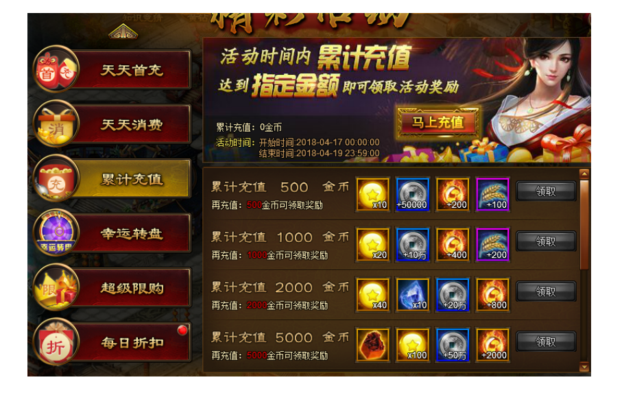 活动内容:活动期间累计充值达到指定金额即可领取丰厚奖励。