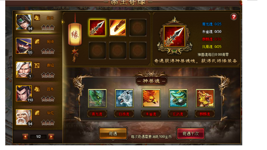 活动内容:活动期间可通过奇遇一次或奇遇十次神兽魂魄,收集神兽魂魄达到要求可获得金色装备或金色技能。