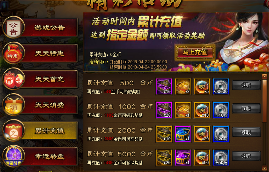 活动内容:活动期间单日累计充值达到指定金额即可领取丰厚奖励,奖励每日重置。