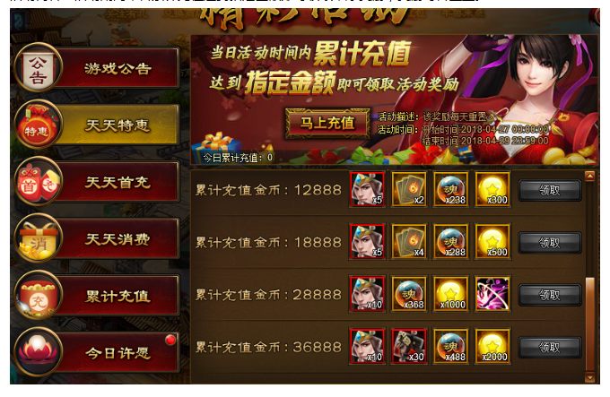 活动内容:活动期间单日累计充值达到指定金额即可领取丰厚奖励,奖励每日重置。