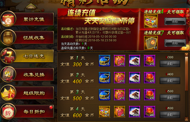 活动内容:活动期间每日充值达到指定金额即可领取丰厚奖励,连续充值达到四天、七天还可领取额外奖励。