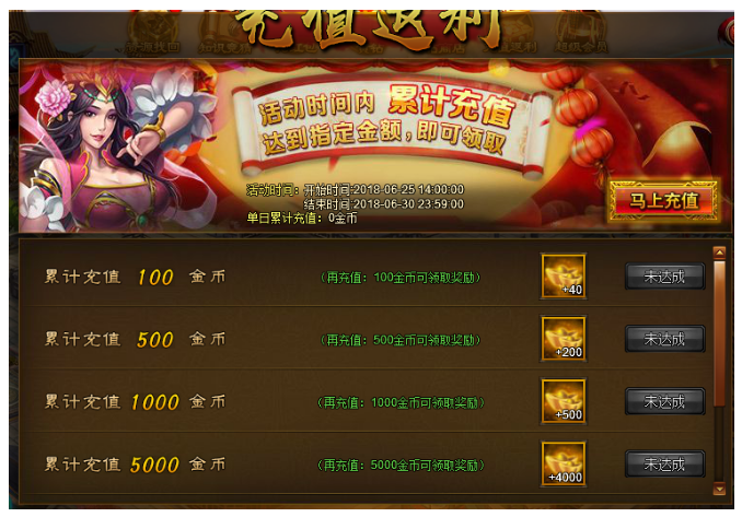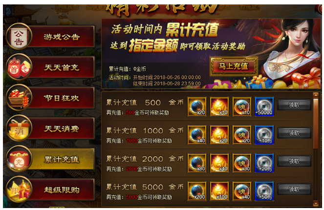 活动内容:活动期间累计充值达到指定金额即可领取丰厚奖励。