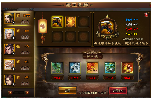 活动内容:活动期间可通过奇遇一次或奇遇十次神兽魂魄,收集神兽魂魄达到要求可获得金色装备或金色技能。