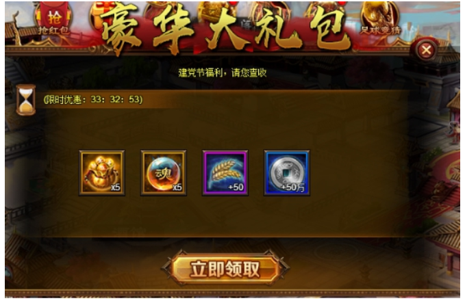 活动内容:活动期间登录游戏即可领取节日福利(建军节)豪华大礼一份。