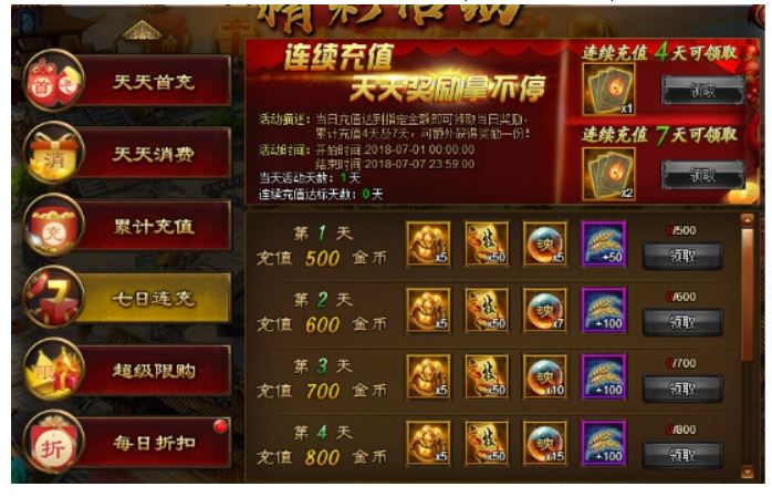 活动内容:活动期间每日充值达到指定金额即可领取丰厚奖励,连续充值达到四天、七天还可领取额外奖励。