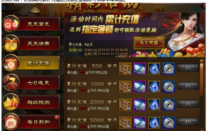 活动内容:活动期间累计充值达到指定金额即可领取丰厚奖励。