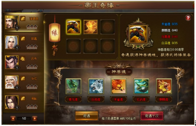 活动内容:活动期间可通过奇遇一次或奇遇十次神兽魂魄,收集神兽魂魄达到要求可获得金色装备或金色技能。