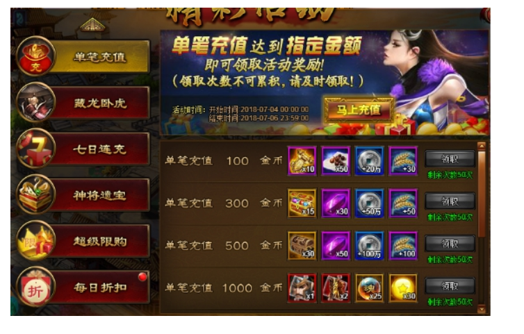 活动内容:活动期间单笔充值达到指定金额即可领取丰厚奖励。
