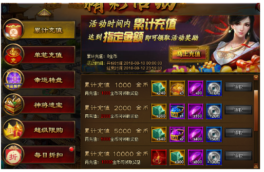 活动内容:活动期间累计充值达到指定金额即可领取丰厚奖励。
