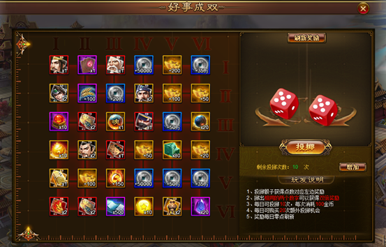 活动内容:活动期间消耗金币投掷骰子可获得相应活动奖励,奖励包含高级红将和众多金币材料。
