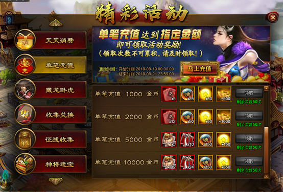 活动内容:活动期间单笔充值达到要求即可领取丰厚奖励。