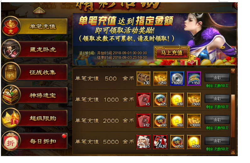活动内容:活动期间单笔充值达到要求即可领取丰厚奖励。
