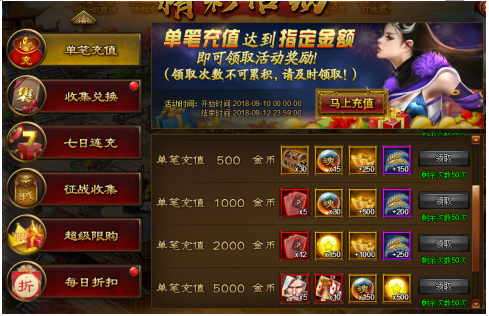 活动内容:活动期间单笔充值达到要求即可领取丰厚奖励。