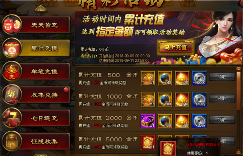 活动内容:活动期间累计充值达到指定金额即可领取丰厚奖励。