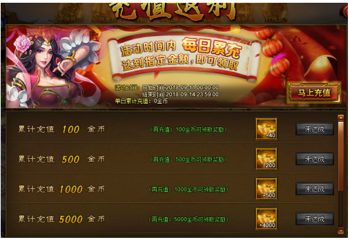 活动内容:活动期间单日累计充值达到指定金额即可领取丰厚金币返利。