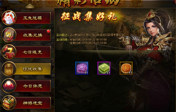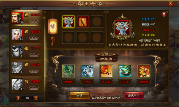 活动内容:活动期间可通过奇遇一次或奇遇十次神兽魂魄,收集神兽魂魄达到要求可获得金色装备或金色技能。