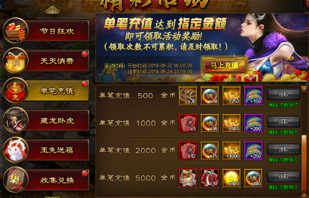 活动内容:活动期间单笔充值达到要求即可领取丰厚奖励。