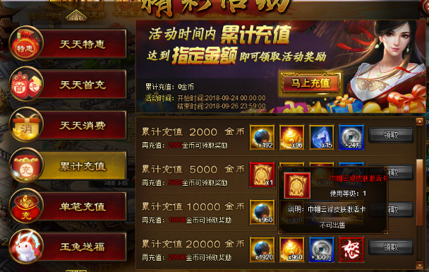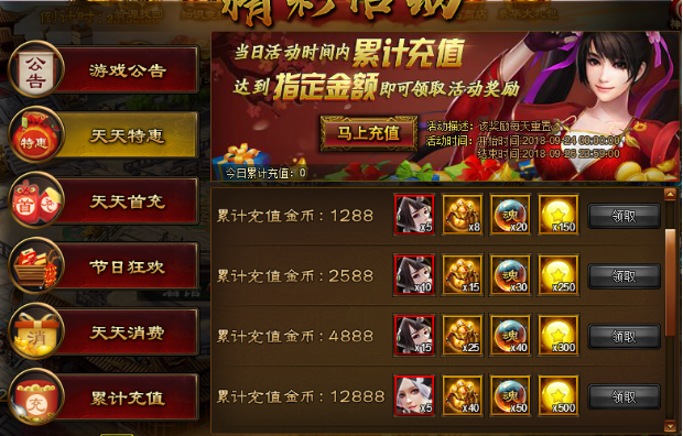 活动内容:活动期间单日累计充值达到指定金额即可领取丰厚奖励,奖励每日重置。