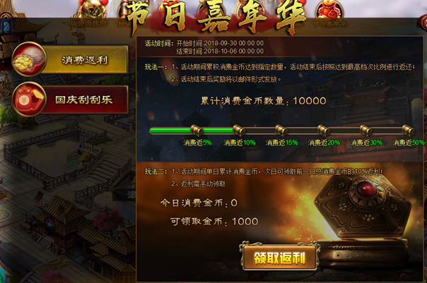 活动内容:活动期间累积消费金币达到指定数量,活动结束后按照达到最高档次比例进行返还。
