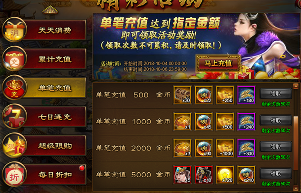 活动内容:活动期间单笔充值达到要求即可领取丰厚奖励。