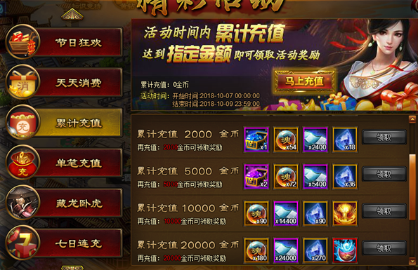 活动内容:活动期间累计充值达到指定金额即可领取丰厚奖励。