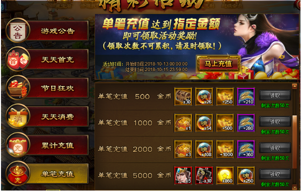 活动内容:活动期间单笔充值达到要求即可领取丰厚奖励。