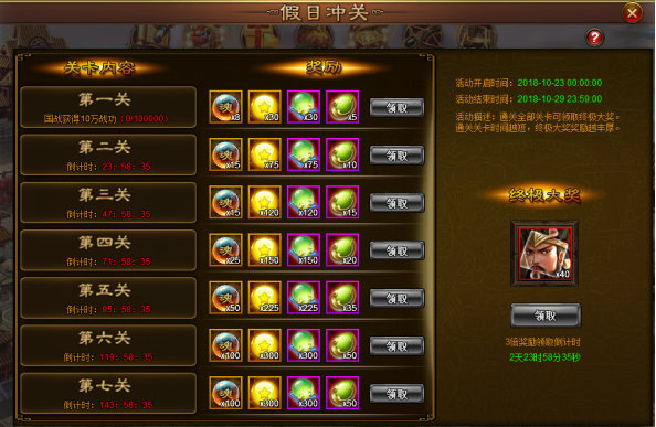 活动内容:活动期间通关全部关卡可领取终极大奖,通关时间越短,终极大奖奖励越丰厚。