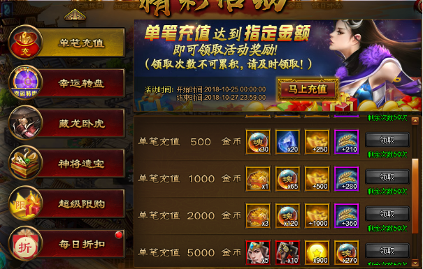 活动内容:活动期间单笔充值达到要求即可领取丰厚奖励。