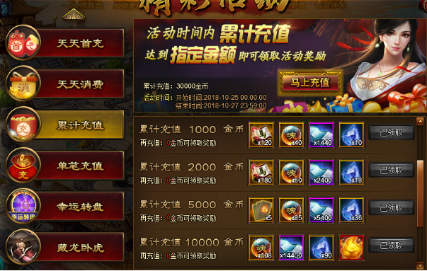 活动内容:活动期间累计充值达到指定金额即可领取丰厚奖励。