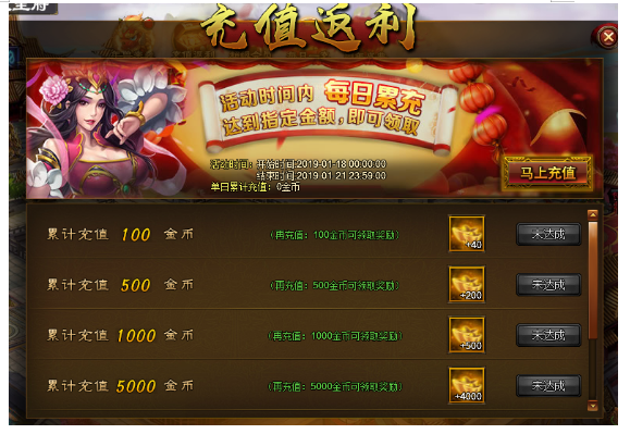 活动内容:活动期间单日累计充值达到指定金额即可领取丰厚金币返利。